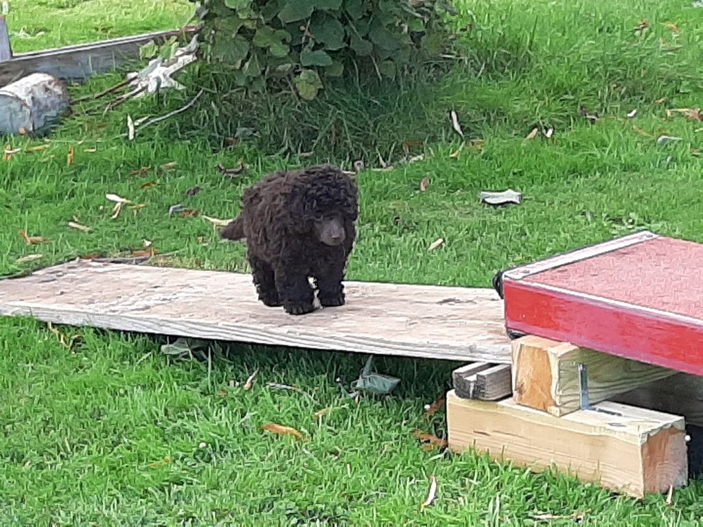 Habituée à la maison, aux bruits domestiques ( aspirateurs....), socialisée avec les caniches adultes, familiarisée avec le collier et la laisse, les mini-agrées d'agility et les autres animaux ( poules naines, lapins)